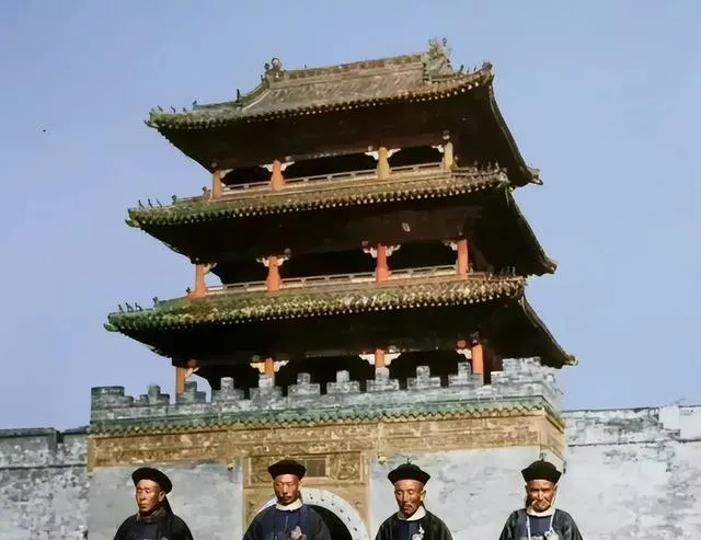 这四位穿补服的,是刚退朝的清朝官,身后重檐城楼层层叠,瓦当亮得像新擦过,站姿端,袖口宽,手里或握笏或垂手,风一刮,衣摆贴腿,照片没有声,却能想见木底靴在青砖上的嗒嗒响,现在开会散场出门,手机拿在手里,第一件事是看消息。
