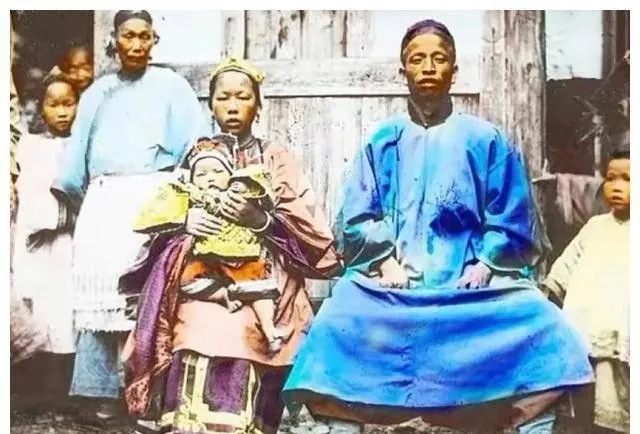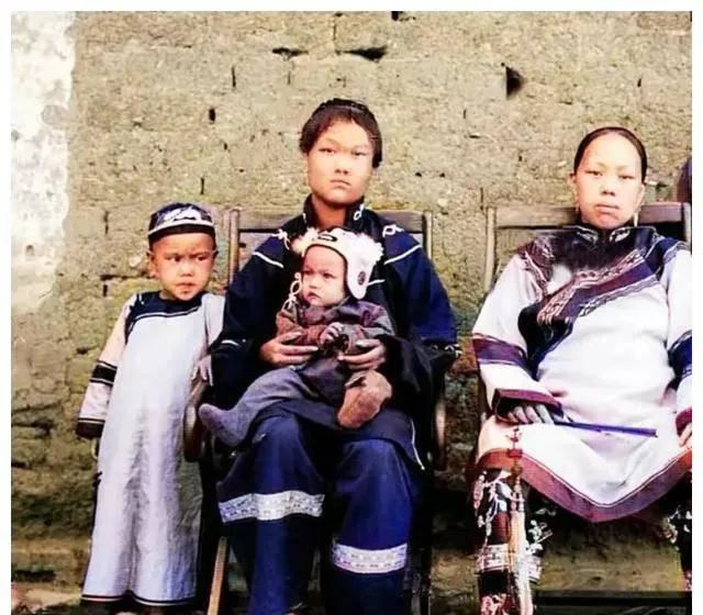 图中这一家坐在粗糙的木门前,男人穿着蓝绸长袍两腿分开坐得稳,叫太师椅的硬木椅子支着腰,女人怀里裹着襁褓,小儿子靠在父亲膝边发愣,最左边半露着脸的多半是下人或亲戚,拍照那会儿讲究排位,谁坐谁站都有门道,男人居中是面子,女人抱小是家里核心的活儿,以前拍一张要攒钱去照相馆,今天手机咔咔一顿拍,照片多了反倒没了分量。