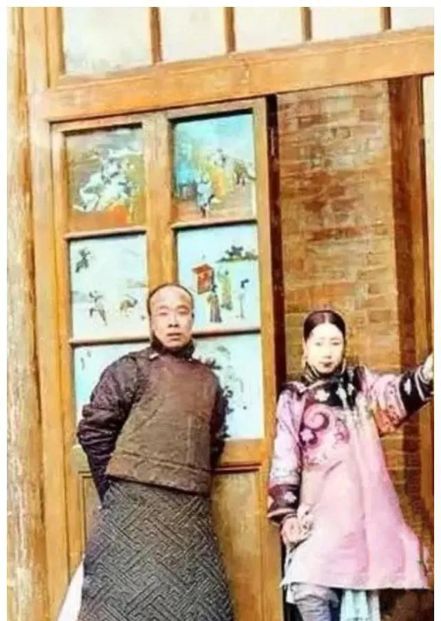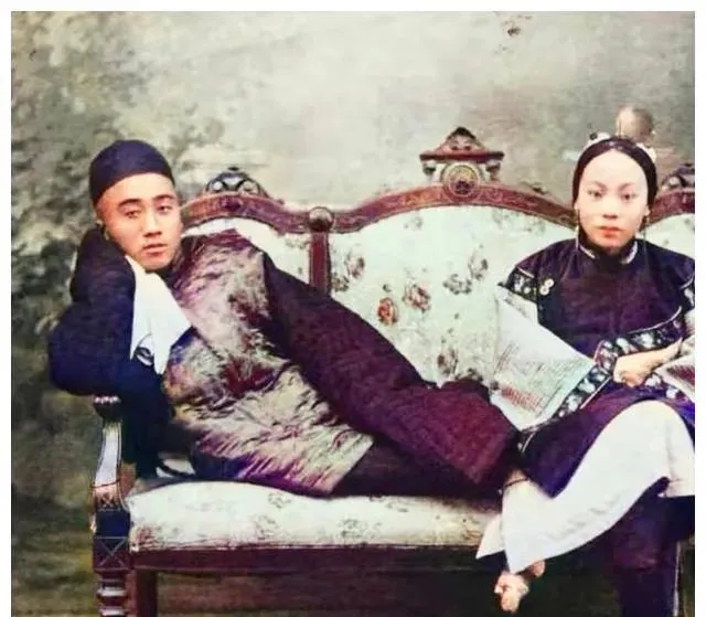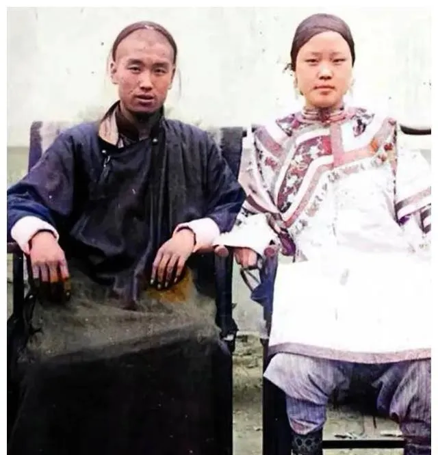 这一对看着就年轻,脸嫩得很,男的穿褛衣女的披绣披肩,袖口露白,指节沾着灰,像是刚忙完活儿就被拉来坐了个相,旁边的椅子是官帽椅的样式,直靠直坐,拍完估计还得赶集买盐,那个年月结婚没有婚纱照,顶多就是这样一张,放在箱底压着,等孩子长大翻出来才晓得爹妈当年的模样。