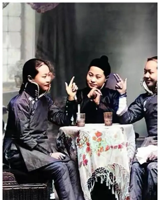 这三位在玩划拳行令,手指开合快得很,桌上不见酒壶却摆着几杯饮料,可能是茶汤或汽水,衣服却是男式对襟,这就有点潮了,姐妹们凑在一起,笑意从眼角飞出来,小时候过年我姑们也会这样玩,输的在院子里跑一圈,围观的人起哄,热闹的劲儿跟现在的狼人杀差不多。