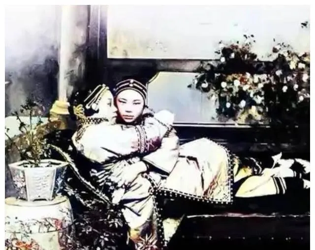 这张更少见,两个姑娘依偎在榻上,衣角滚着密密的钉珠,手镯蹭在袖口上能想见哗啦的轻响,院里盆栽一排,角落里有个插屏做背景,闺中话本来就私密,能被留在影像里,说明那会儿也有人敢把亲密放到镜头前,以前人讲规矩,现在人讲自我,各有各的好吧。