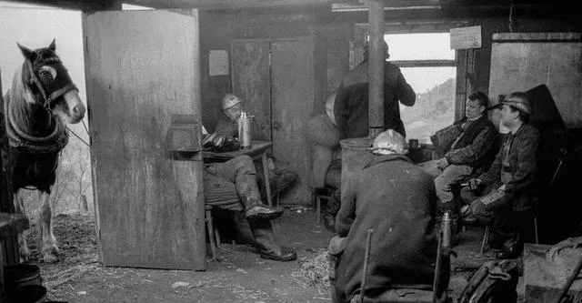 这间屋里最显眼的是煤炉和搪瓷水壶,炉盖半掀着,火星往外蹦,墙上挂油布雨披,门口拴着匹马,几个人围坐不说话,气喘在冷空气里成白雾,表针走得慢,换班的脚步走得快,这类沉默的歇脚,我在乡矿也见过,一杯浓茶下肚,腰能撑到下班。