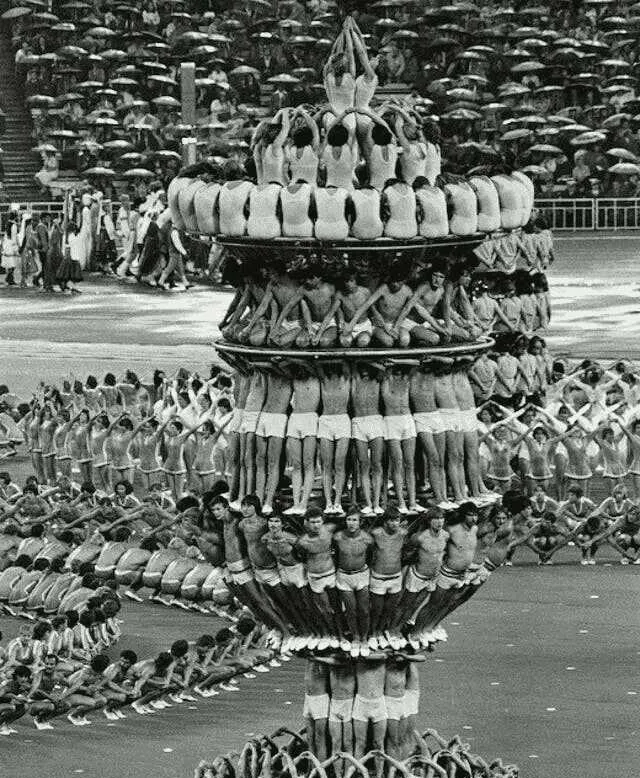 这座活的塔叫人塔,一圈圈肩背相叠,短裤与白鞋一律整齐,肌肉在阳光里泛光,口号声像潮,外面队形铺成花纹,爸爸说学校开运动会时也排过字样,站到腿直打颤,终点枪一响全散开,到现在想起那阵踏地的震动,还能在脚心里嗡一声。