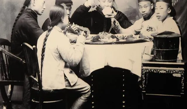 这张里的圆桌是榆木的,边上钉着黄铜包角,茶盅盖碗挤得满满当当,男丁扎着辫子,筷子一抬一落,像打拍子,小时候过年在姥姥家也是这阵势,长辈先动筷,孩子们眼睛跟着盘子转,等一句“开动吧”,那叫一个香。