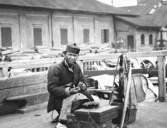 图中这处土墙木栏叫牲口棚,墙皮斑驳,木桩粗糙,马靠在栏边喘着热气,地上垫的是碎草和土坯,男人蹲在角落里,脸上风刻出来的沟沟坎坎一清二楚,一棚两用,牲口住,人也挤着过夜,奶奶说那会儿冬天风一钻,棚里比屋里还暖和一点点,可味儿冲得很,混着草腥子和牲口汗味,这一幕把清末底层的紧巴劲儿照了个真切。