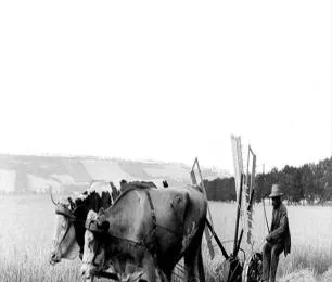 最后这个是牛拉的割草机,铁齿轮高过人腰,木扶手在农人手心里磨得发亮,牛耳朵往后搭着,步子稳,齿片像梳子一样把草推倒,爷爷说庄稼地里就看这个声儿,咔嚓咔嚓直顺,割完一片再回头看,地皮平得像被人抹过一把油,现在联合收割机一趟过,快是快,田里那点人味儿倒淡了些。