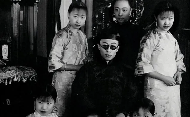 这个戴黑墨镜的男子坐在中间,穿着绸缎长褂,身边是几个穿旗装的女孩,图里叫全家福,摆拍味很足,表情却松弛,镜片把眼神挡住了,倒更有点世故,外头的局势汹涌,屋里人还得照常过日子,奶奶指着最角落的小孩,说看,手抓着桌沿不肯站好,像极了你小时候。