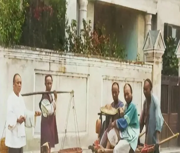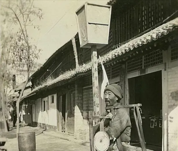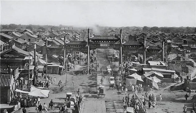 图中这条街正中是牌楼,木梁高挑,斗拱压着檐角,穿过去就是主街,地面是土道,车辙印深得能蓄水,两边铺子用竹篷布一支,卖茶的吆喝声、车夫的脏话、驴蹄敲地的脆响混在一起,就是当年的城市背景音,奶奶说赶早市得摸黑出门,抢到头茬蔬菜才算赚着。