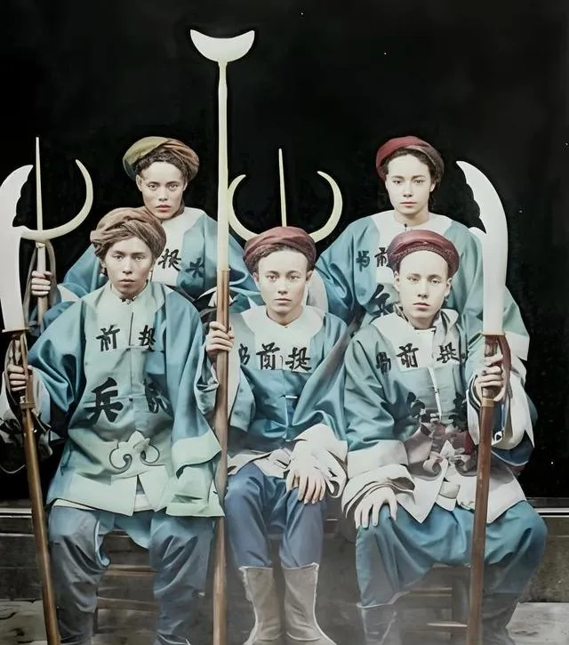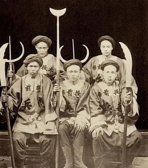 这些长柄的叫钩镰叉朴刀,衣襟上写着字,是营名和协名,坐姿规规矩矩,脚下穿云头靴,像舞台队形,其实真上阵多是传令护卫,照片里凶巴巴的样子,八成是照相馆里让装出来的神情。