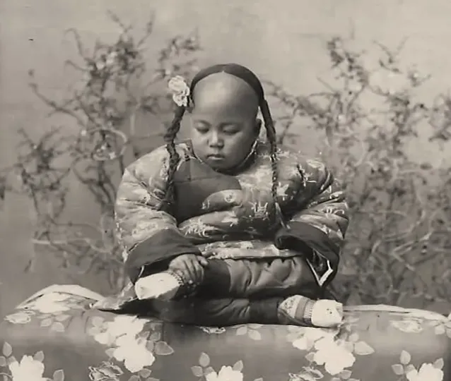那么小的脚,被硬生生的裹成三寸金莲,是钻心疼的,她手里还拿着玩具,脸上却没什么笑容,是早熟的,那时候大户人家以这个为美,却不知道孩子受了多少罪,现在看这种习俗,是残忍的,是愚昧的,那种痛苦是隔着屏幕都能感觉到的,家人们,你看到这种照片是什么感受,
