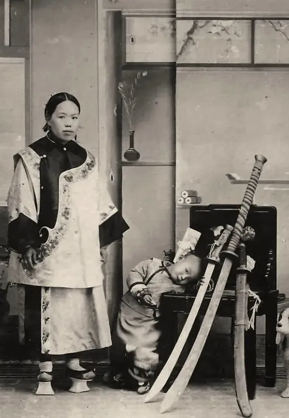 这照片有点意思,是以前旗人妇女和儿子的合影,阿豪注意到,旁边摆着三把大刀,