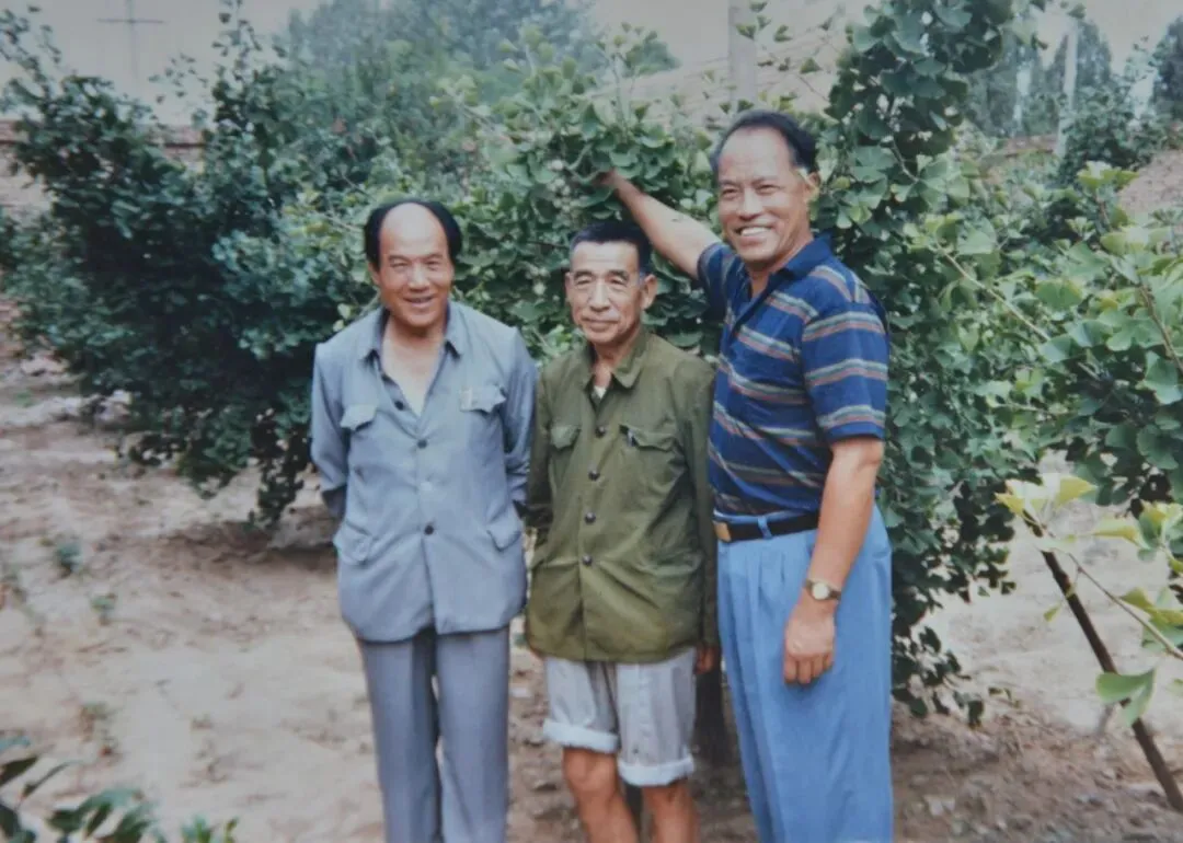 >菏泽老照片:小留公社前王楼种银杏树,左一:申玉仁,左二:李晔