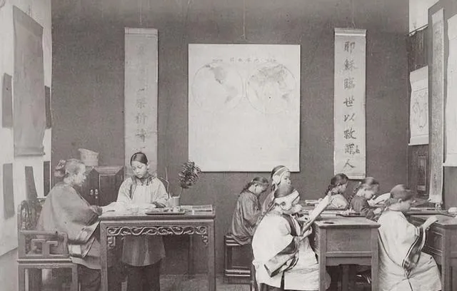 这个场景叫新式学堂,墙上挂着世界地图,桌案雕花轻薄,孩子们歪着头抄写,旁边坐着一位女教习,手里捏着细细的笔杆,奶奶说她第一次看见地球两半圆,就琢磨我们家在圆上哪里,老师敲桌子说别抠字纸,赶紧念声调,现在学校里讲多媒体,那时候就靠这一张地图撑门面。