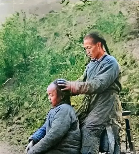 图中小铺门口,剃头匠端个铜盆,左手撑头右手推刀,亮光一闪,前额刮得光溜,后面的发束搓油拧紧,再缠黑绸缎,男人们一坐一站就齐整了,师傅抖抖围布,嘴里念叨走咯,明个再来,爸爸说夏天最解暑的不是西瓜,是这一刀推下去的凉意。