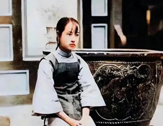 这张最温柔,女孩坐在铜缸旁,衣服浅浅的灰,前襟叠一道深色,耳垂上坠着小圈,脸干净,像秋天第一碗清粥,爷爷说那会儿人不时髦,干净就是体面,过年织的新袜子要晒在窗台,给邻里瞧一眼才算喜气。