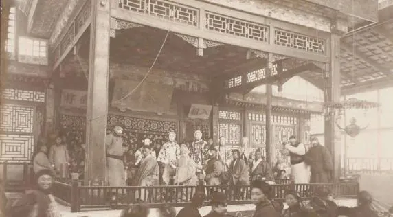 这张老照片是戏园子,台口雕栏,靠背椅横成一排,锣鼓一响,孩子就趴在栏杆上,胡子一捋一甩,满台子水袖打圆,爷爷年轻时在角落卖瓜子,嘴上喊着热的,耳朵却不落一句唱词,现在大家拿手机刷视频,那时一出戏能让人念叨半个月。