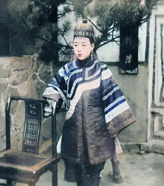 图中这位穿着讲究,厚袍子压出折痕,肩头的纹样像一条折水纹,旁边靠着一把格子椅,背板雕着字样,当时照相是件稀罕事,姿势得摆稳,呼吸要收住,不然糊了就浪费钱,摄影棚里挂布一层又一层,灯光却全靠天窗。
