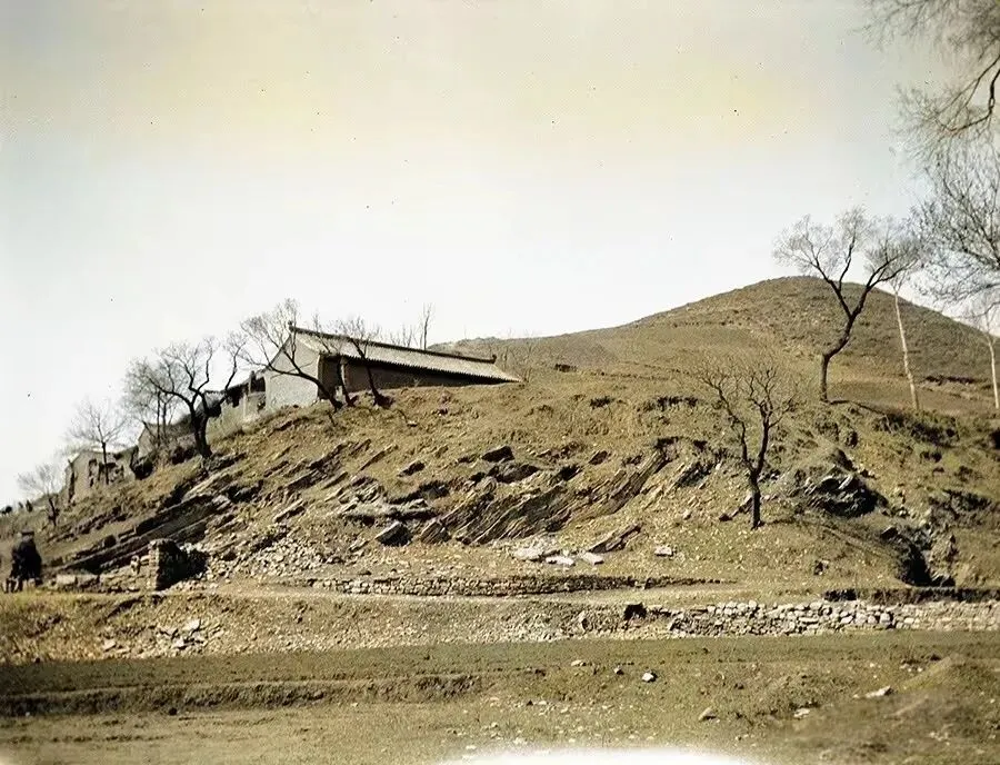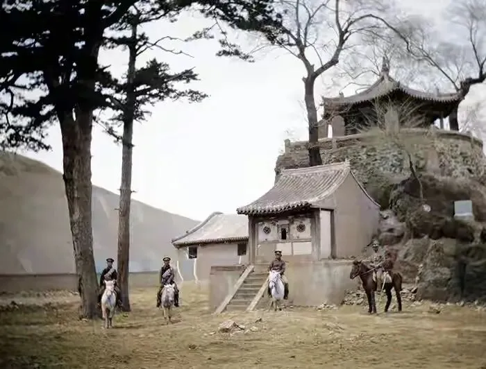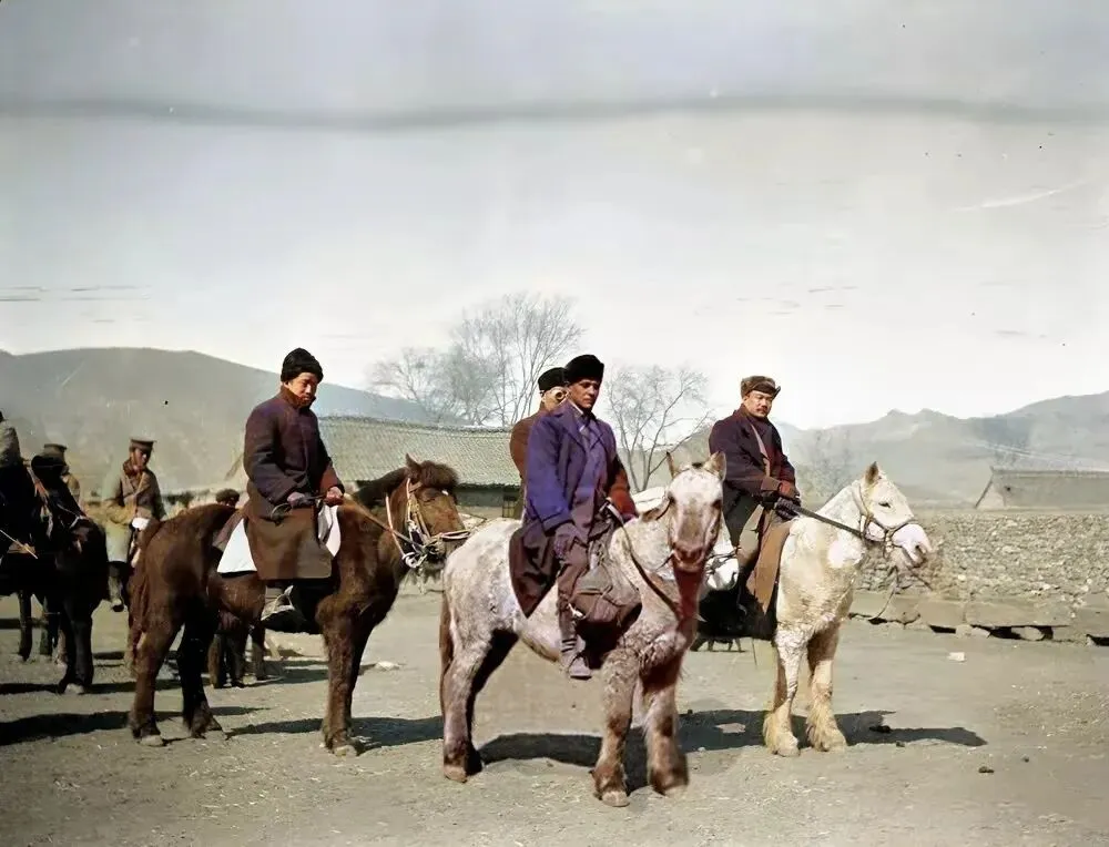1914年的冬天,克拉普团队骑着马,正经过赤城县,其中骑白马的就是克拉普。马队后面有几间瓦房。