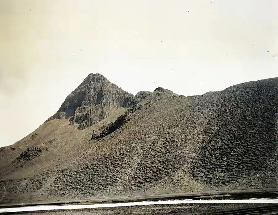 克拉普一行人来到这座特别的高山下,看到半山腰的寺庙,拍了这张照片。山很高,寺庙上面部分似乎都是石头山,不见草木。