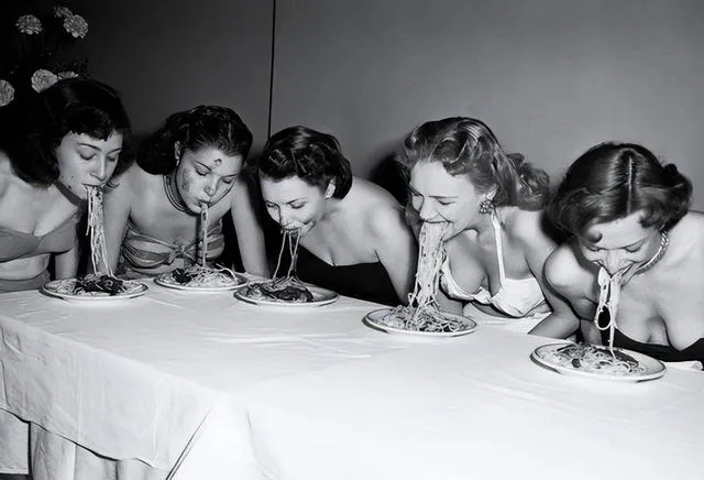 这场只准低头用嘴吃面的比赛挺稀奇,桌布平展,几位女士弯着腰往盘里凑,像极了我小时候和弟弟抢热干面,妈妈在旁边敲碗说,慢点别噎着,时代不同,玩笑一样,热闹的场面总能让人笑出声。