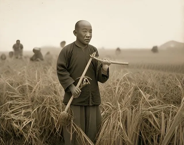 图中这把长柄木耙叫搂子,柄直头圆,末端绑着草穗刷,用来把割下的麦子往一堆拢,风一吹,麦芒哗啦啦,男人脚下是被镰刀割平的茬口,密密一片像刷子一样扎人手,奶奶说那会儿收麦子最怕阴天,湿气上来就得翻场晾一遍,不然囤里要长霉,现在联合收割机一圈下去,麦秆都打成了秸秆包,省力是省力,味道却没了。