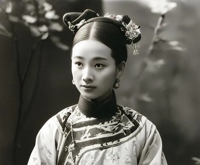 这个发式叫两把头,鬓角贴得光,秧针簪子从侧边挑出一点点亮,衣领团寿纹细密,女孩眼神清,像刚进门的秀女,规矩先学站和行礼,膝盖微屈不得晃,老师嬷嬷最爱拿细尺子点手背,那一下不重,脸却挂不住。