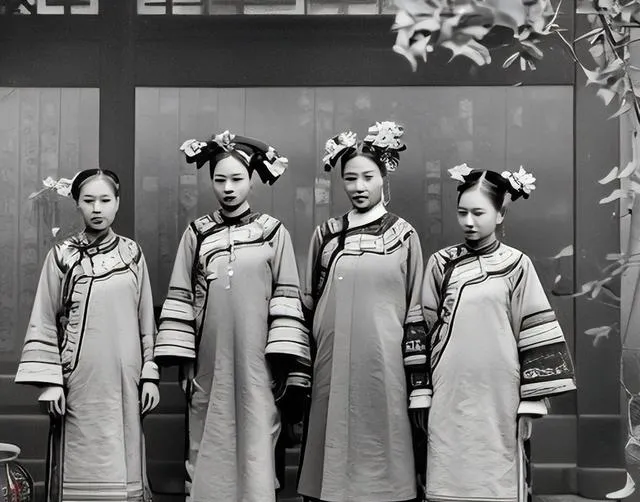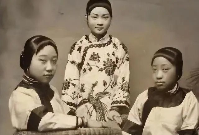四人并排站,袖口三道纹,脸色白得发粉,妆面厚但眼神各不相同,左边的小个子眼睛往下看,像是在背避讳,右边那位抿嘴,可能刚挨了教习的训,照片一张冷冰冰,却能看出谁强谁弱。