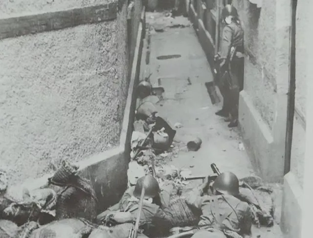 这张巷道里的身影让人心里一紧,倒伏的影子和冷硬的钢盔挤在一起,狭窄的墙面像是把呼吸都夹窄了,爷爷不愿多看,说那会儿最怕的就是街拐角,一转弯命就不见了,照片是证据,也是伤疤。