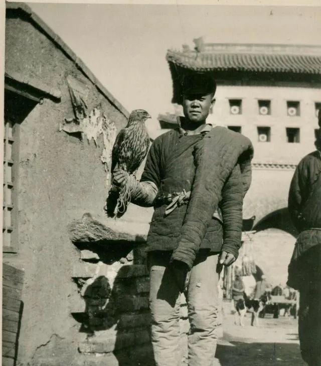 这个汉子手里立着的叫苍鹰,爪子戴皮护,袖子厚厚一层棉,城门洞后面就是早市,爷爷说老一辈逮兔子靠它,鹰一抖翅,风像刀一样切脸,回到手上时眼神贼亮。