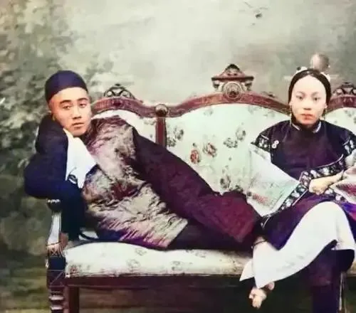 这对坐在椅子上的年轻人是新婚夫妇,男的长袍马褂,女的肩披花纹的衣襟,眼神有点生,没笑也不尴尬,老照片里的人大多这样,镜头前不敢乱表情,怕失礼,怕露怯。