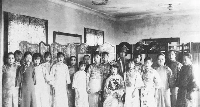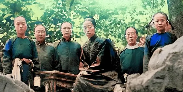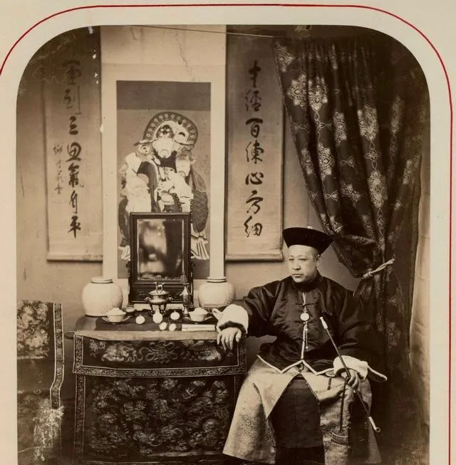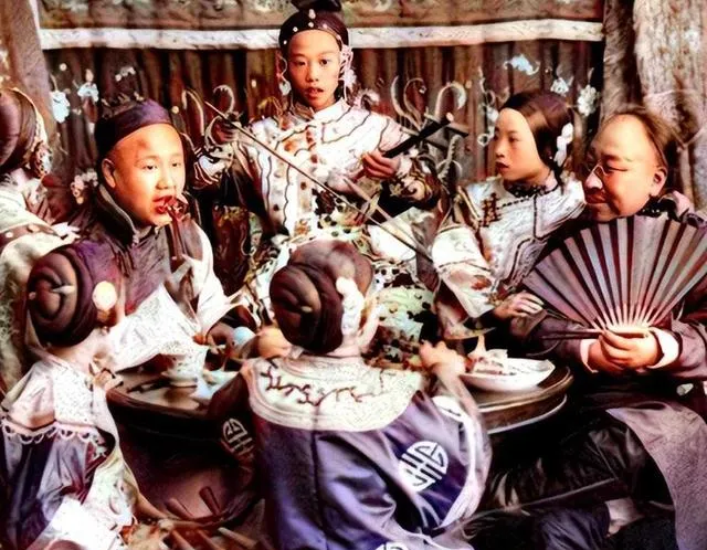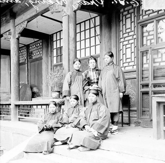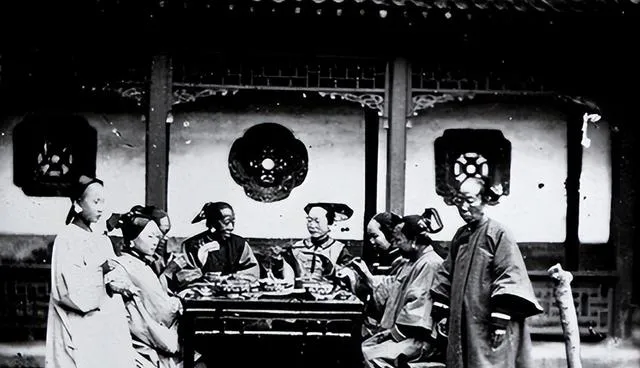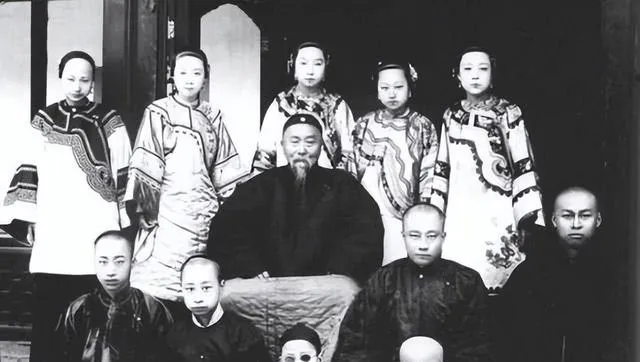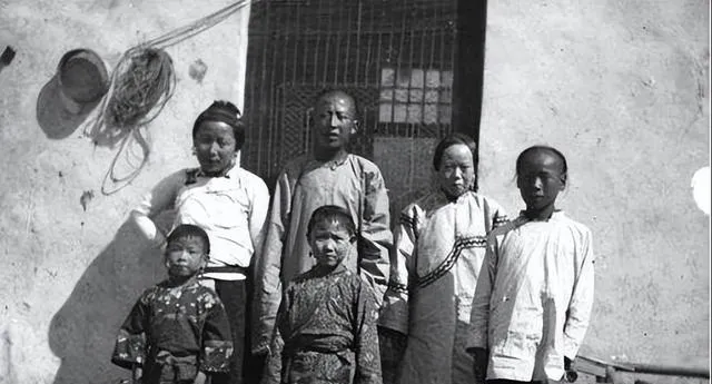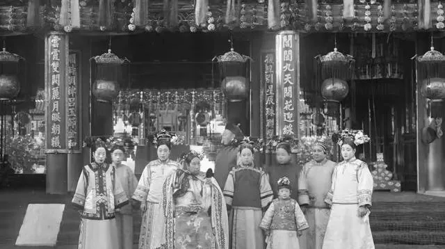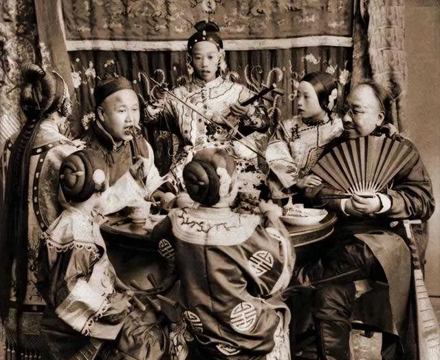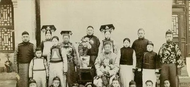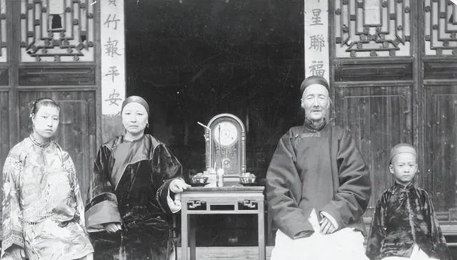 这一桌钟摆在中间,家人分坐两侧,绸缎衣料垂着亮光,镜头按下的那一刻,屋外可能还在敲更,屋内却把时间按住了,老照片就是这样有劲。