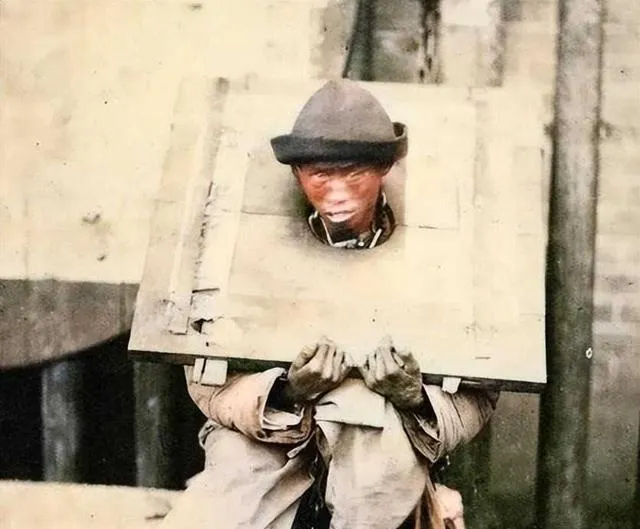 图中这块大木板叫枷,厚重的杉木拼成一方,脖颈被卡在圆孔里,肩膀全靠硬木托着,稍微动一下,边角就咯得人生疼,牌面上写着姓名罪由,等同一块会走路的告示牌,以前县门口常能见到,站一天脖子麻,站三天人就虚了,奶奶看老照片总摇头,说那时过街的人不敢看一眼,怕沾晦气。