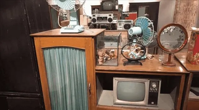 这组柜子上摆着风扇、闹钟、黑白电视,年代一眼能看出来,小时候看案侦片,警笛一叫屋里人全安静,电视机的嗡嗡声像在说话,现在手机一划世界都到眼前了。