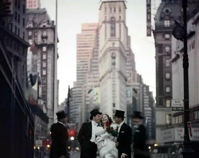 这张街头合照里的人穿得体面,手里捧着花,背后楼影一层压一层,照片一冲出来就显得体面,家里长辈见了会念叨,人只要站直了,在哪儿都像样。