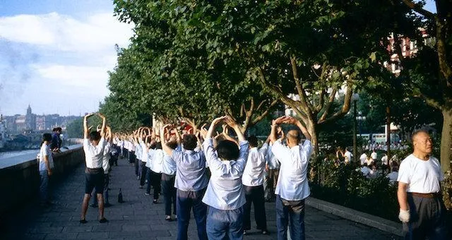 老树根旁小桌一张,白瓷盖碗映着光,站在后头的年轻人手捧茶壶,眼角往镜头这边瞟,爷爷说,热茶要高冲低斟,泡到第二道才好喝,这话我记到现在,每回端杯都想起他那手势。