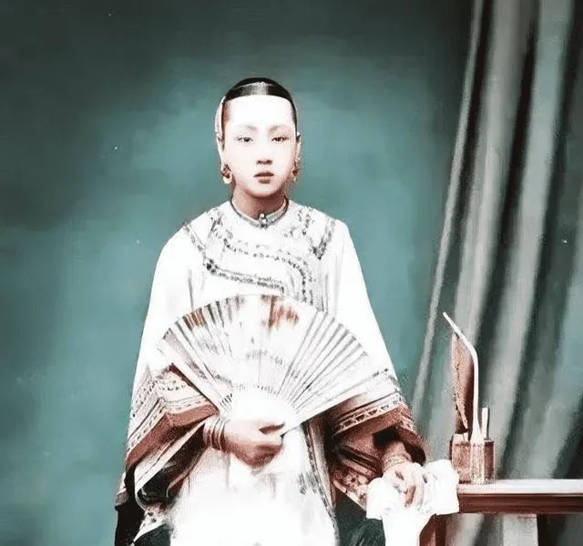绛红滚边从肩头绕到襟口,手里摇着折扇,旁边桌上放着西洋钟和茶盏,时辰一走一停,像在等谁敲门,外面的布景画成山水,假的,一眼就能看出来,可不妨碍人家坐得端,神气得很。