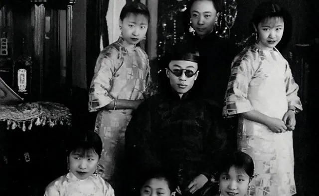 这一张最抓眼的是那副黑墨镜,窄窄的镜腿卡在鬓角上,身上是深色绸料长袍,光可鉴人,旁边围着几位少年和丫鬟打扮的女孩,站姿拘谨,手都不知往哪放,小时候第一次见到这种照片还以为是戏班子合影,奶奶说,可别瞎说,这是末代皇帝落座拍的家中合影,镜子后头那点点灯影,是旧宫里留出来的体面。