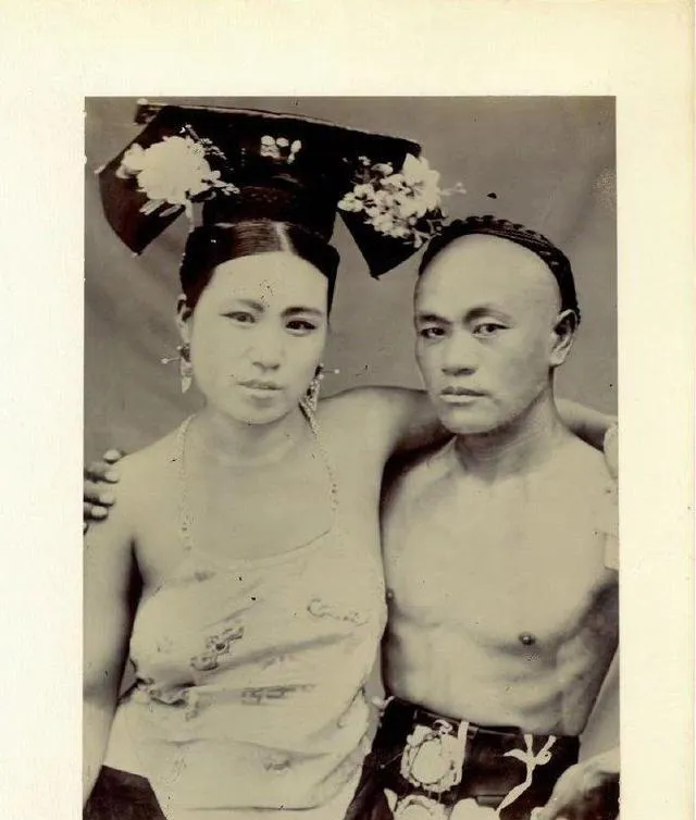 花球圆滚滚,绳穗垂到腰际,男的脸绷着不笑,女的眼睛却亮,门口的砖坎子有个小洞,是老鼠打的窝,这种小细节,老照片里最有味儿,越看越有劲。