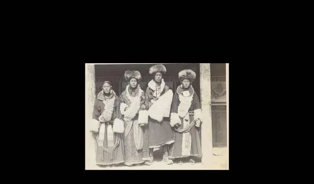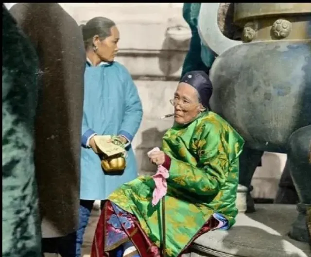 图中这身大花堆绣的衣裳叫旗装礼服,头上压着宽檐的旗头,像两块小屋檐,花团簇拥着脸颊,肩线被硬衬托得笔挺,别笑丑不丑啊,那会儿就兴这个牌面,走起路来步步生风,家里长辈说穿上它,腰杆子就得直着。