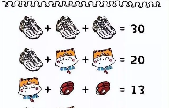 这张小画儿是个算术谜题,鞋子小猫和手套摆成一排,看着简单,一算就犯迷糊,表弟来我家吃饭,边嚼边算,嘴里嘟囔着等号,筷子都敲成节奏了,还不肯放弃,一顿饭硬是吃成了打擂台。