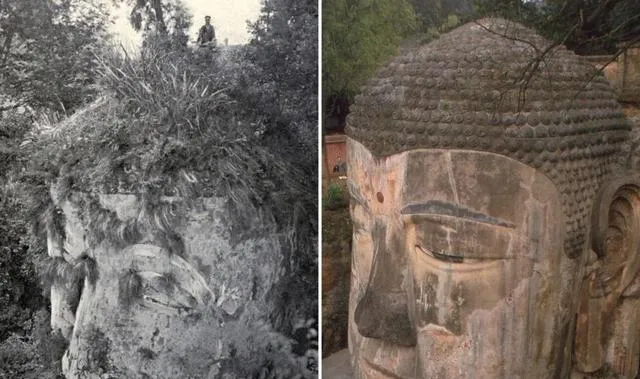 这两张并排的照片里是乐山大佛,左边头顶杂草丛生,右边发髻珠粒分明,爷爷指着说,以前风吹雨打没人管,现在修缮有了规矩,江雾一上来,鼻尖上都是潮气,站一会儿衣服就打湿了。