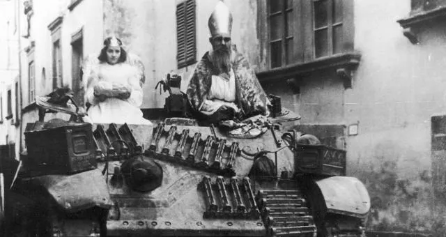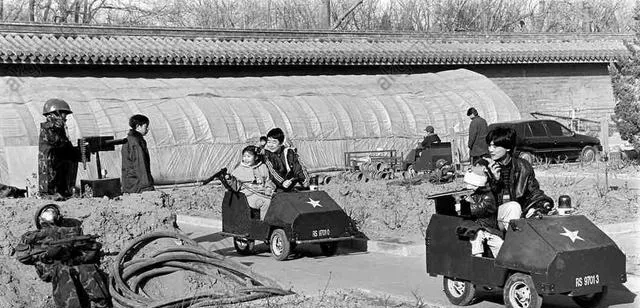 装甲车上坐着角色扮演的老者和小姑娘,铁皮上挂满弹链,车从巷子里咣当过,荒诞和日常撞在一起,反而把那个年代的神经质照得清清楚楚。