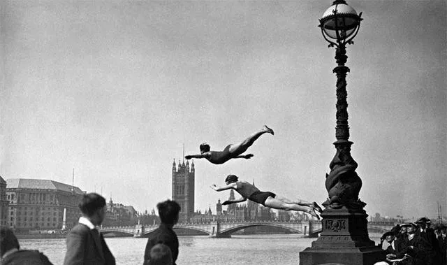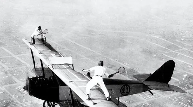 两个人在机翼上对打,白衣白鞋,笑得很欢,底下是城市的网格,年轻人胆子就是大,拿风当场地,把云当观众,想想也痛快,现在我们被安全绳拴得牢靠,刺激少了,故事也少了点。
