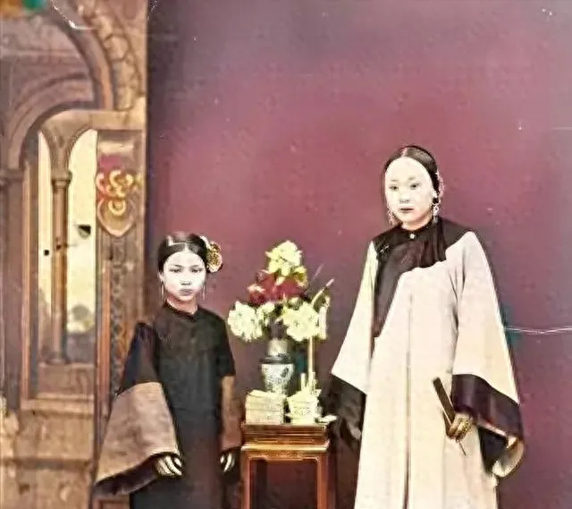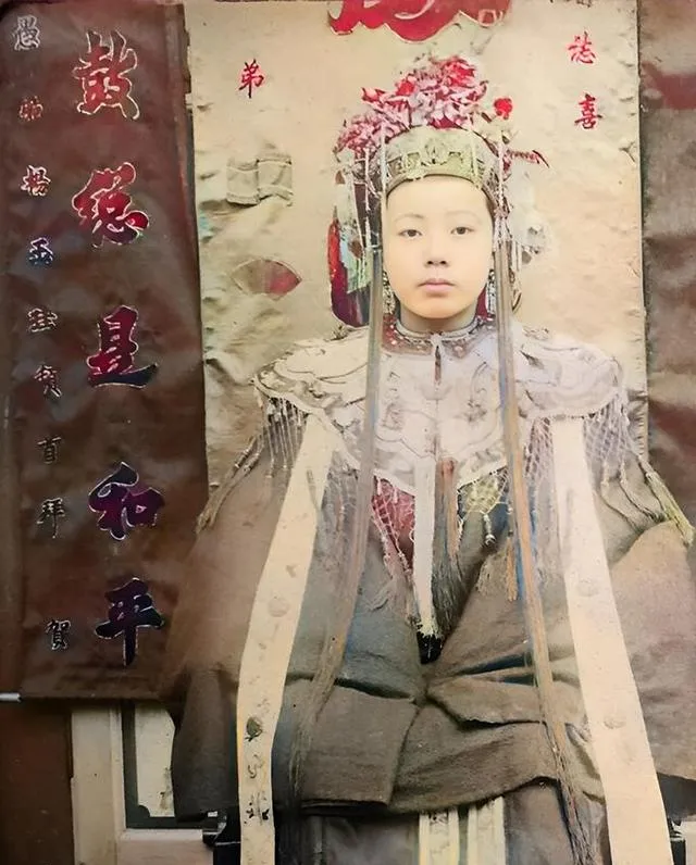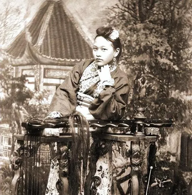 图中这位端庄秀美的小娘子叫婉容,发冠上嵌珠点翠,细枝花叶压在鬓边,身上是一袭浅色袄裙,绵密暗纹在光里泛着细光,手扶小方桌,眼神有点怯也有点倔,旧影里的人啊,总带着不言的光,听奶奶说她们那代人拍照都不笑,怕失礼,怕轻浮,后来我们拿手机咔嚓一阵,笑得见牙不见眼,时代变了,镜头前的规矩也跟着变了。