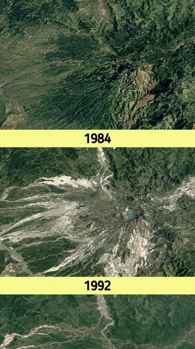 这三段拼图像把时间切开给你看,山体的纹路一年年换,白色冲刷痕像爪印,你要说历史是书,其实也像地皮上的记事本,写着写着就改了样,过去谁舍得抬头看这些,现在卫星图一放大,生长和消退都在眼皮底下。
