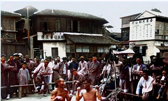 这张热闹,台下围了一圈人,口号一声高过一声,擂台上两位抱拳比划,后头招牌写得工整,摊贩的吆喝声仿佛还能听见,小时候赶集也这样,东一口糖葫芦西一口切糕,嘴里甜了,脚下就不累了。