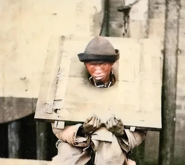 这个木方框叫枷,四角铁扣,脑袋从中间的圆洞探出来,沉得很,肩膀一时半会儿受不了,旧时的面子刑罚就是让人抬不起头,现在我们更讲法度,枷板进博物馆,成了警示。