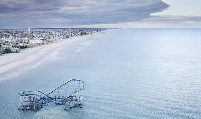 海边那截过山车泡在水里,像断了的鱼骨,天光冷冷,岸线拉得老远,一场风暴就能把巨物拽下海,人和造物在自然面前,还是得学会低头。