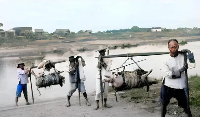 这些人用的是扁担和麻绳,猪倒挂着还挺安静,肩窝垫着布条,走起路来一肩一肩地颠,水边风一吹,麻绳有股生味儿,那会儿讲究的是力气和默契,现在有轻卡有三轮,谁还这么抬呢。