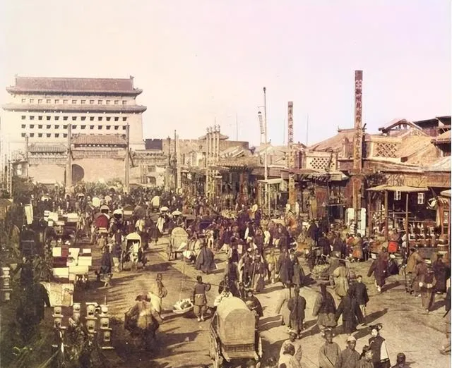 这张是热闹的标配,城楼像个大伞,底下摊贩层层叠叠,卖菜的把青萝卜堆成小山,卖布的举着尺子比划,年轻的旗人女子背影一闪而过,裾摆沉沉的,妈妈看了嘀咕一句,这身行头走一圈得出一身汗。